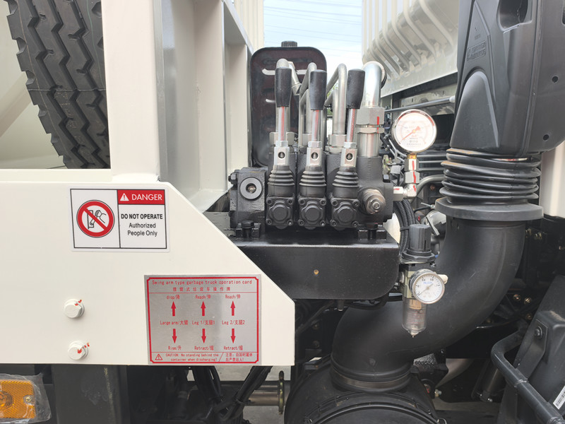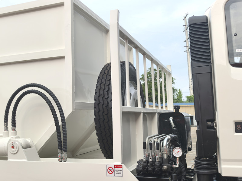 Smetiarske auto HOWO s otočným ramenom sa skladá predovšetkým z podvozku, hydraulického systému, mechanizmu otočného ramena a odpadkového koša. Počas prevádzky vodič ovláda hydraulický systém na pohon otočného ramena. Hák v prednej časti otočného ramena sa zachytí oká odpadkového koša, čím sa kôš plynulo zdvihne na plošinu a bezpečne sa zaistí.