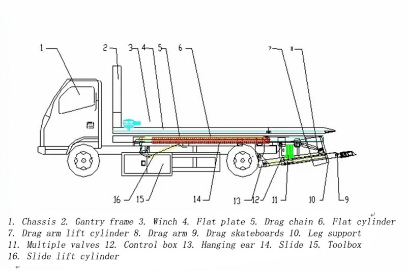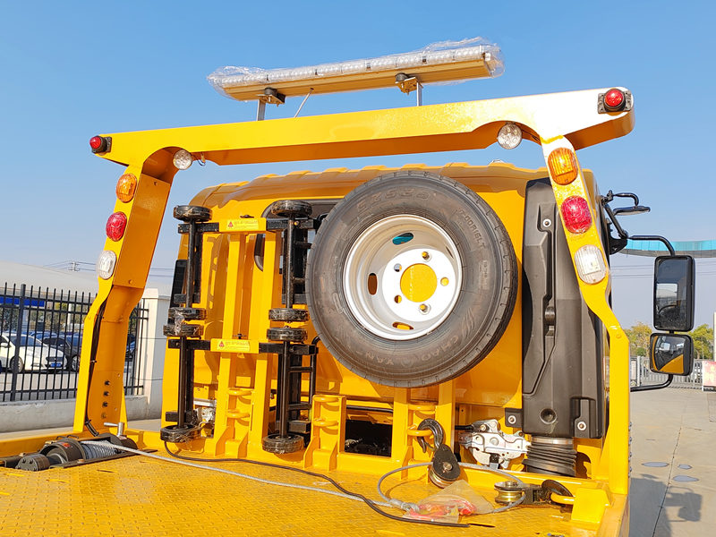 Nadstavba 3-tonového plošinového odťahového vozidla pozostáva prevažne z nosného ramena, hydraulického systému, navijaka, oceľového lana a ovládacieho systému, ktoré umožňujú zdvíhanie, ťahanie a prepravu vozidiel. Jej robustná a flexibilná nadstavba, hydraulicky ovládaná pre presné zdvíhanie a zasúvanie, je ideálna na bezpečné a efektívne operácie, ako je odťahovanie na cestách, odstraňovanie nehôd a odťahovanie nelegálne zaparkovaných vozidiel.