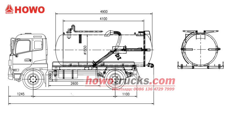 Odsávacie vozidlo Howo s výkonom 300 HP používa podvozok Howo 4×2 s rázvorom 4600 mm. Je vybavené dieselovým motorom WP10.300E22 s výkonom 300 koní a objemom 9,726 l, ktorý je spárovaný s prevodovkou HW13710 a systémom riadenia ZF8198 a 7 pneumatikami 295/80R22.5, čo zabezpečuje vysoký výkon a stabilitu. Telo nádrže je vyrobené z vysoko kvalitnej uhlíkovej ocele, vďaka čomu je robustné a odolné, a je vybavené vysokoúčinným systémom vákuového čerpadla s funkciami samonasávania, samovyprázdňovania a samovyprázdňovania.