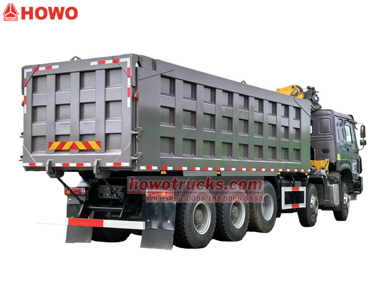 TheŤažobný sklápač Howo so žeriavom je postavený na Howo ťažký pohon 10x4podvozok, vybavený WP12S400E201dieselový motor a HW19710 10-rýchlostná prevodovka. Má silný výkon a dokáže sa prispôsobiť zložitým pracovným podmienkam. Je vybavená kĺbový žeriav CS s maximálnou nosnosťou 8 ton.Samovykladací nákladný box je vyrobený z uhlíkovej ocele Q235 s odnímateľným hákom a ramenom, ktorá sa vyznačuje vysokou nosnosťou a odolnosťou. Konštrukcia sklápača umožňuje rýchle nakladanie a vykladanie nákladných boxov, čím výrazne zlepšuje flexibilitu prepravy a je vhodný na prepravu sypkých materiálov na krátke a stredné vzdialenosti, ako je stavebný odpad, piesok a štrk.