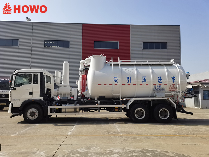 Sacie a tlakové dopravníkové vozidlo HOWO 6x4 s objemom 15 cbm je upravené z podvozku série HOWO TX 6x4. Má rázvor kolies 5800 mm + 1350 mm a je vybavené motorom Sinotruk MC07.31-60 s výkonom 310 koní a 9-stupňovou prevodovkou HW13709XST. Je vybavené nakladacou nádržou (primárne na nakladanie práškových a granulovaných materiálov, so zvareným vonkajším rebríkom a chodníkom, zdvíhacími okami, pozorovacími otvormi a hladinomerom zvareným na vrchu nádrže), sacím zariadením, vyprázdňovacím zariadením, filtračným systémom (filtračné vrecká) a zadným ovládacím systémom. Je vybavené vákuovou pumpou YIFENG SK-15 a vzduchovým kompresorom BDW-10/2.