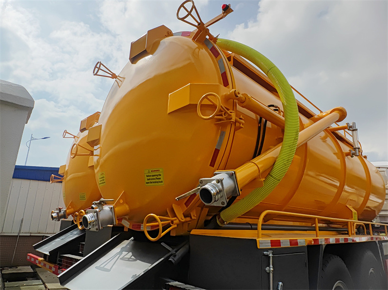 2x13000Ten/Tá/To Howo 20 cbm komerčné čistiace vozidlo na odvodňovanie je efektívne a spoľahlivé vozidlo určené na mestskú hygienu a čistenie priemyselných odpadových vôd. Obsahuje saciu nádrž s objemom 20 kubických metrov. Jeho hlavnú prevádzkovú schopnosť poskytuje obehové vákuové čerpadlo 2BEA-204, ktorého vysoký sací výkon 20 m³/min generuje obrovský sací výkon, ktorý umožňuje rýchle odsávanie viskózneho odpadu. Vozidlo je plne vybavené integrovaným priezorom, vákuovým manometrom a sekundárnym filtrom na monitorovanie a ochranu. Ľavý regulačný ventil centrálne ovláda otváranie a zatváranie zadných dverí a zdvíhanie a spúšťanie nádrže, čím zaisťuje bezpečnú a pohodlnú prevádzku. Je vybavené kanalizačným potrubím, rebríkom a skrinkou na náradie a je široko používané na odsávanie, odstraňovanie a likvidáciu v mestských potrubných sieťach, bytových septikoch a priemyselných nádržiach na odpadové vody.