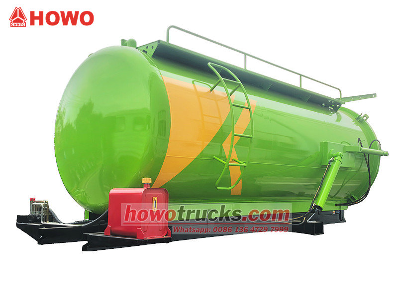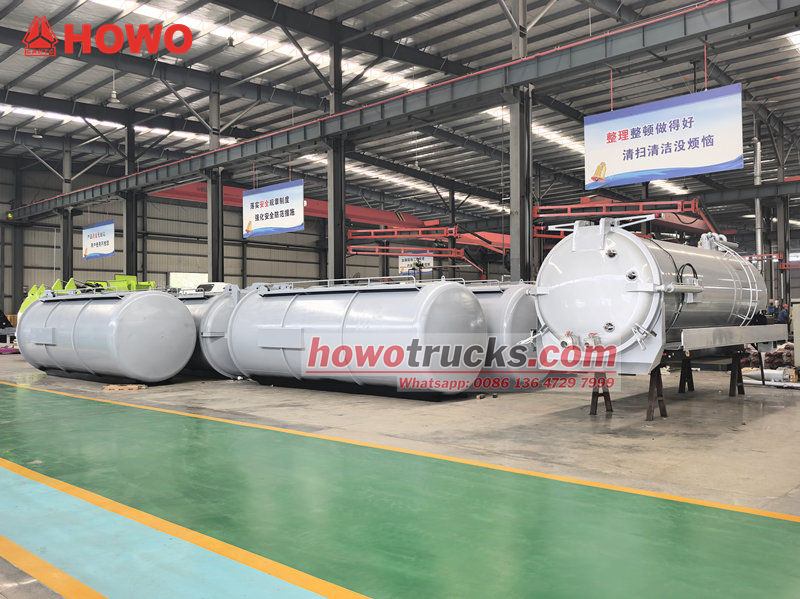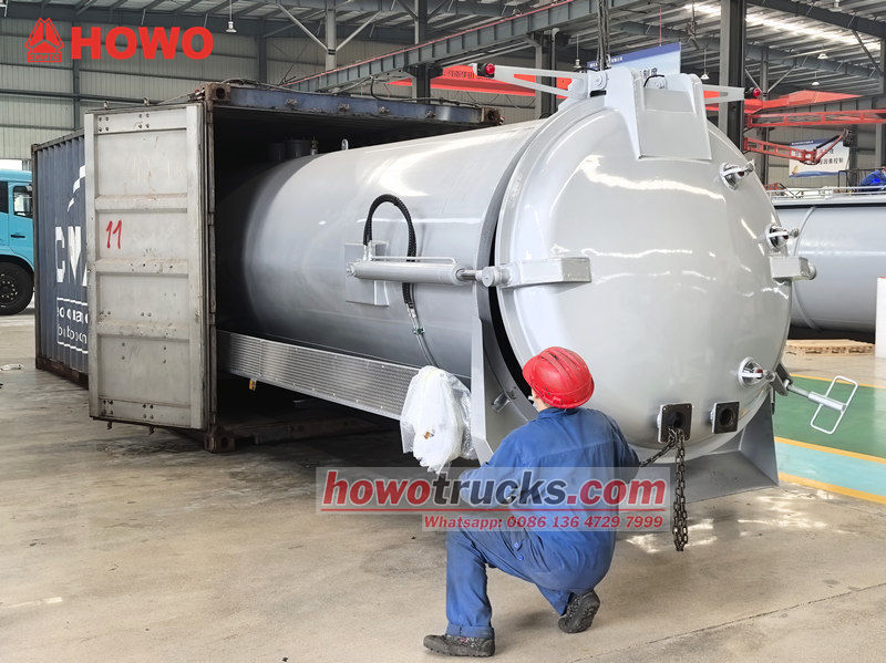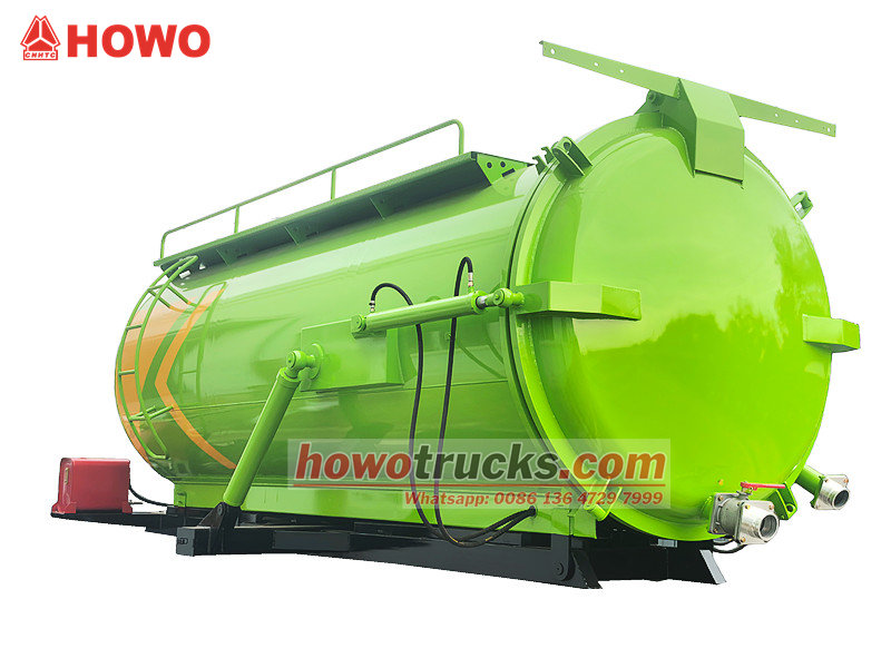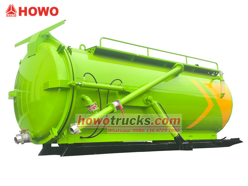Korba sacej cisterny Howo 8cbm (tiež nazývaná súprava vákuového sacieho čerpadla 8cbm, horná časť korby vákuového cisternového vozidla s objemom 8 000 litrov, súprava vákuového sacieho vozidla na odpadové vody 8cbm, súprava hornej časti cisterny na likvidáciu odpadových vôd, nadstavba vákuového cisternového vozidla 8cbm, súprava cisternového vozidla s vákuovým čerpadlom kalu, súprava hornej časti vákuového sacieho vozidla atď.) Používa sa na montáž na podvozok na čistenie a zber kvapalín, ako je napríklad znečistená voda. Je vhodný na čistenie kanalizácie, žumpy, vpustu atď.