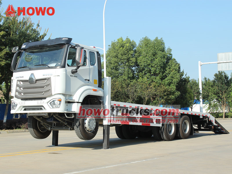 Samonakladací nákladný automobil HOWO NX je profesionálne vozidlo špeciálne navrhnuté na prepravu veľkých stavebných strojov. Je postavený na podvozku HOWO 6×4 a je poháňaný vysokotlakovým motorom Weichai s výkonom 400 HP a systémom vstrekovania common rail, ktorý poskytuje robustný výkon s vysokou účinnosťou a environmentálnou ochranou. Vozidlo je vybavené protišmykovou plošinou s rozmermi 8600×2500 mm, dvoma 20-tonovými hydraulickými výsuvnými podperami vpredu a 4-tonovým hydraulickým navijakom, čím vytvára bezpečný a spoľahlivý systém nakladania a vykladania, ktorý plne spĺňa prepravné a prevádzkové potreby ťažkých rýpadiel a iných zariadení na mieste.