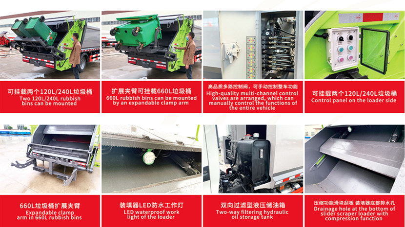 ►Vďaka naklápacím mechanizmom vhodným pre štvorcové aj okrúhle kontajnery a vedrovému zariadeniu na zber objemného odpadu si používatelia môžu vybrať rôzne mechanizmy zberu podľa rôznych metód zberu odpadu.