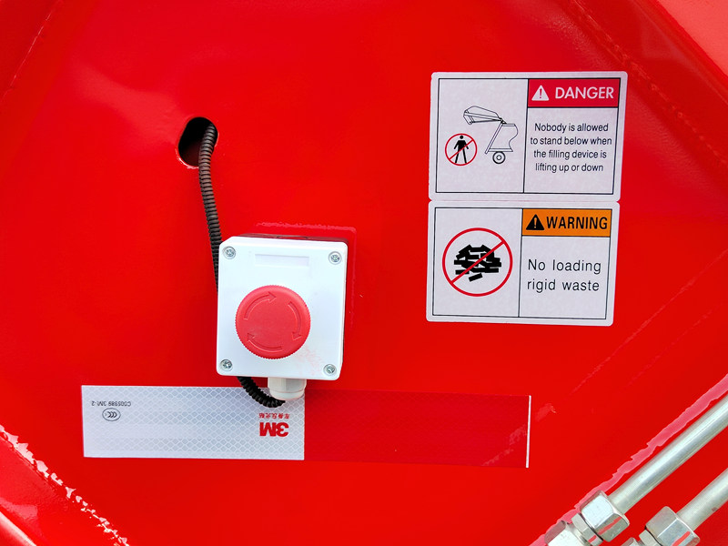 ►Špeciálne navrhnuté tlačidlo núdzovej brzdy umožňuje zastavenie mechanizmu zhutňovania odpadu v akomkoľvek stave alebo polohe, čím sa zaisťuje bezpečnosť personálu a zariadenia.